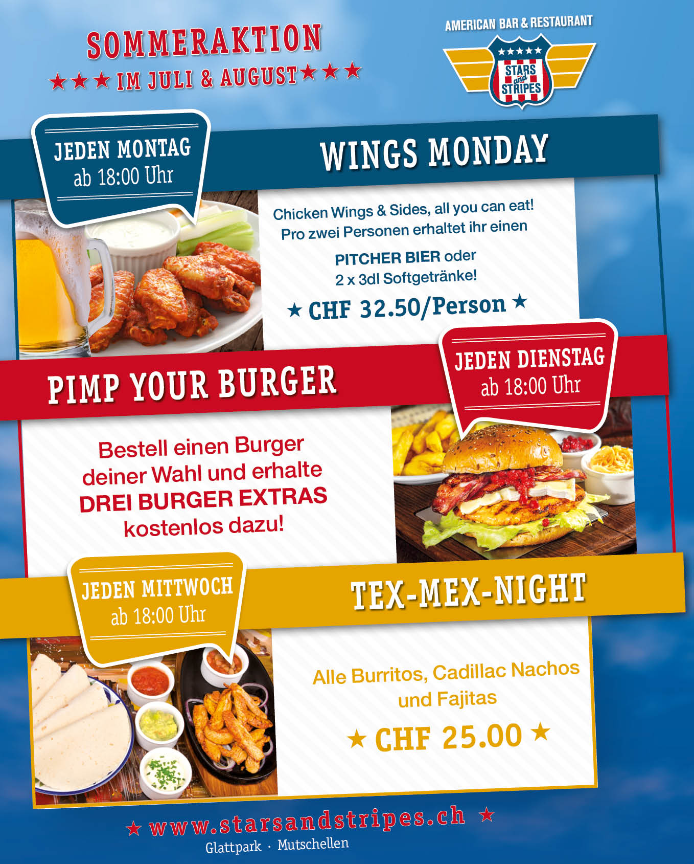 MehrGeniesst mit uns ein All you can eat American BBQ am Samstag, 27. September 2025, ab 14.00 Uhr, exklusiv im Stars & Stripes Glattpark. Saftige Burger, Spare Ribs, Hot Dogs, Brisket, frisches Salatbuffet, Maiskolben, Baked Potatoes, Fries, Grillgemüse, Dessertstation & vieles mehr. Für unsere kleinen Gäste gibt es eine liebevolle Kids-Betreuung mit Spielen & Kinderschminken. Dazu sorgt American Live Music für die perfekte Stimmung. Als besonderes Highlight: unser Jubiläums-Gewinnspiel! Gewinnt einen von 10 Stars & Stripes Gutscheinen.